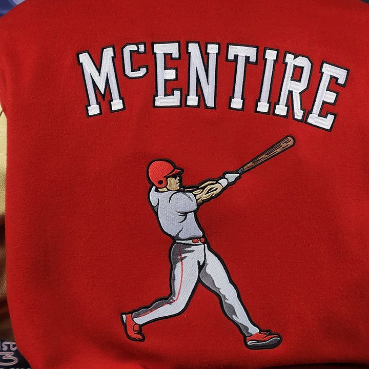 Varsity Block Letter is sewn on